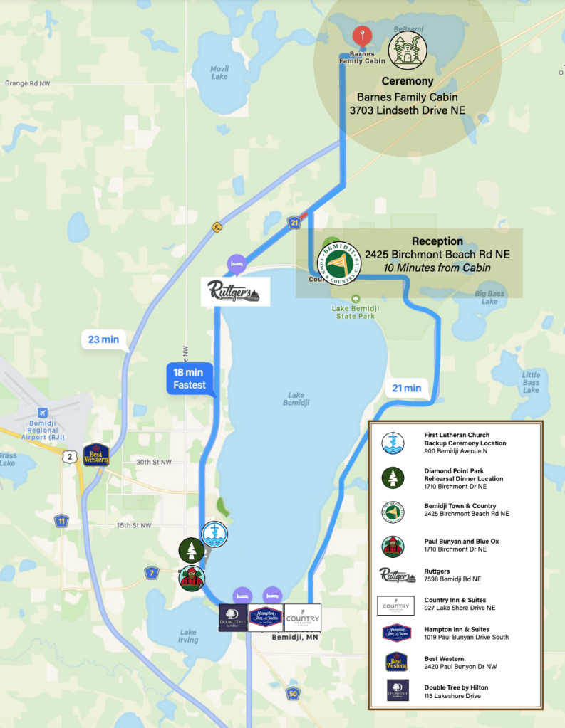 Due to limited parking at our cabin, we have provided a shuttle for you. It will shuttle you from your hotel to the wedding, to the reception, and back to your hotel. Here are the pickup times and locations: